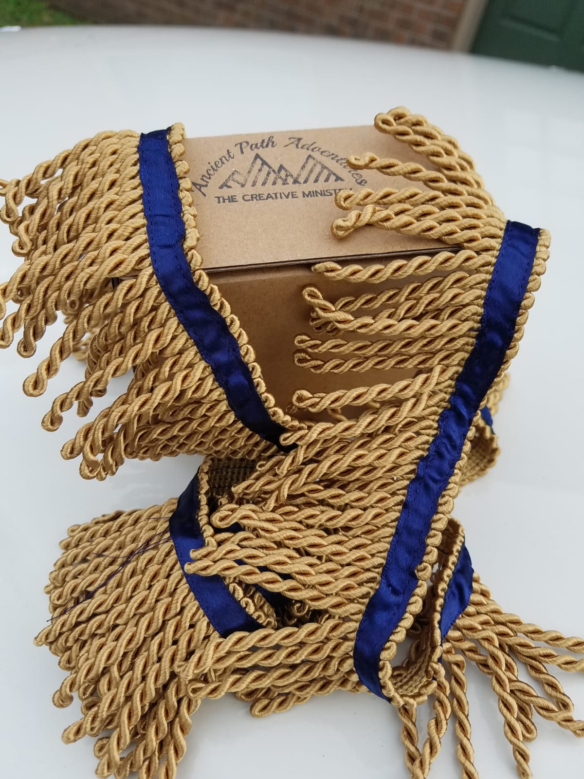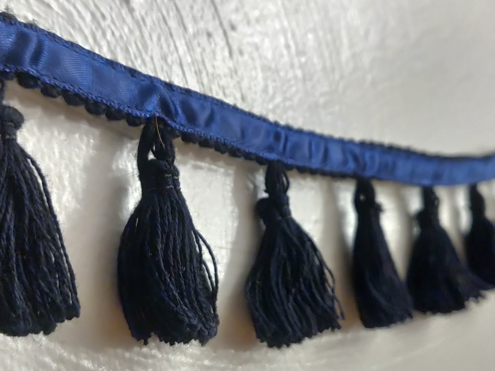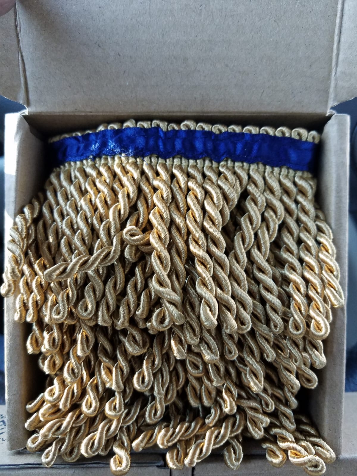 Fringe Strip™ colors are currently black, white, purple, red or gold. Types are brush, tassel or bullion fringes with a navy blue border of blue.