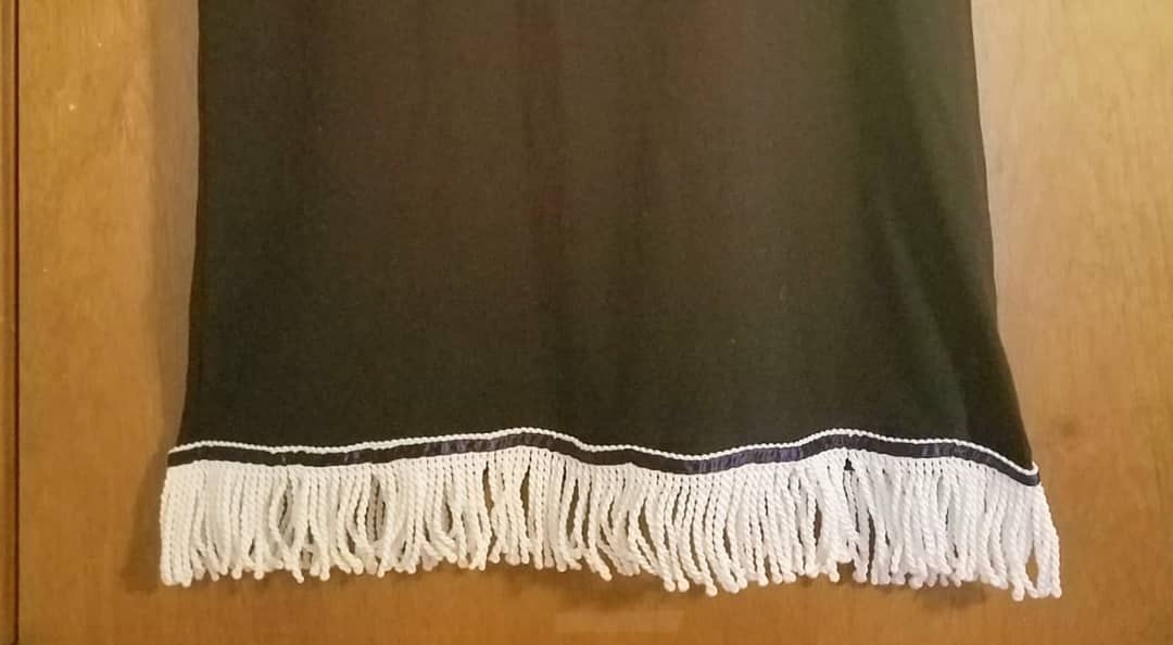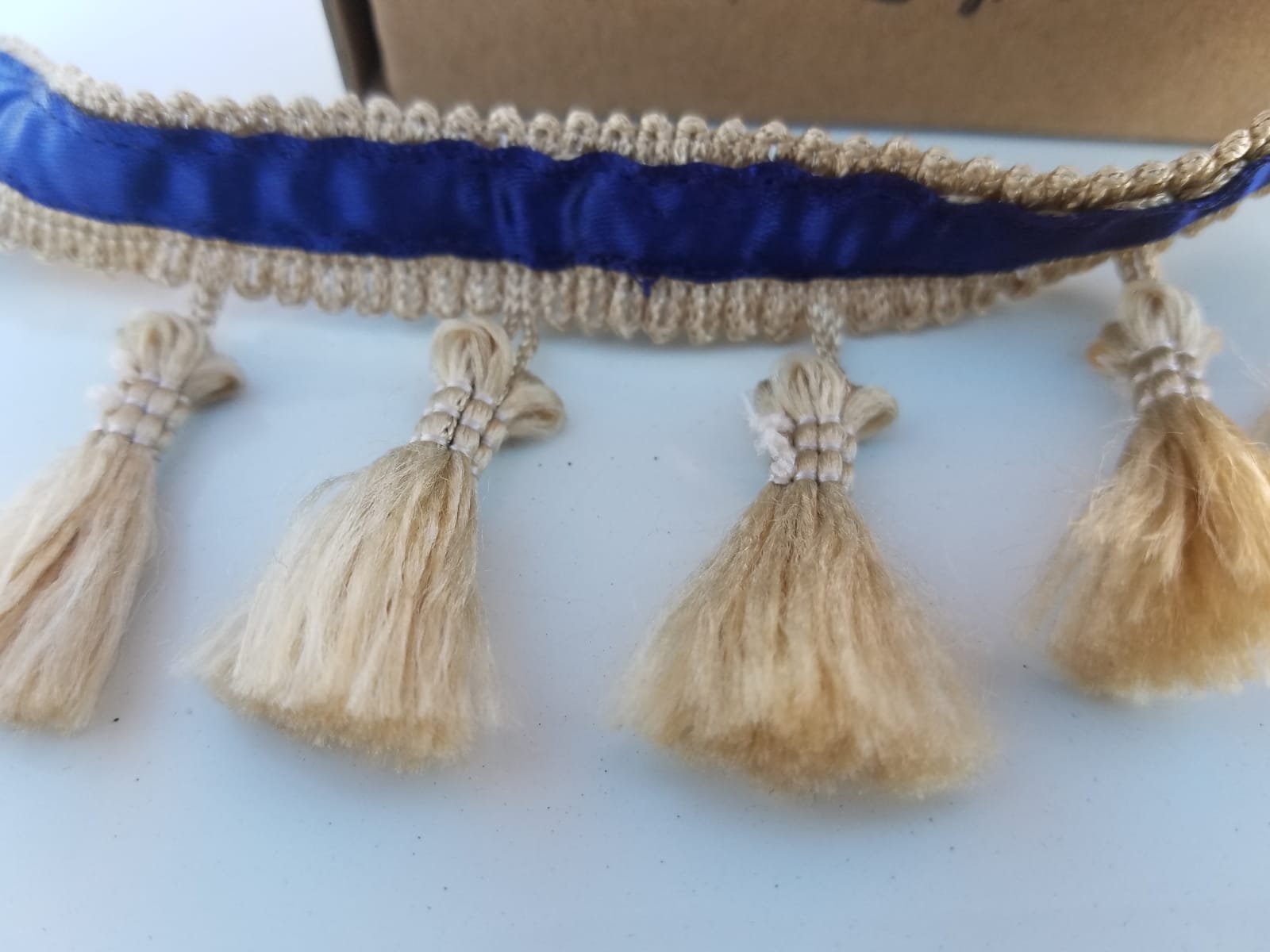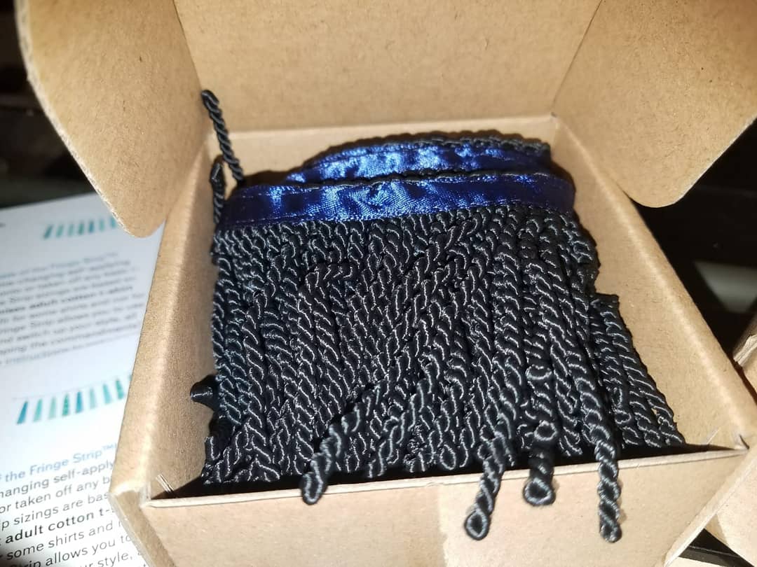 Fringe Strip™ colors are currently black, white, purple, red or gold. Types are brush, tassel or bullion fringes with a navy blue border of blue.